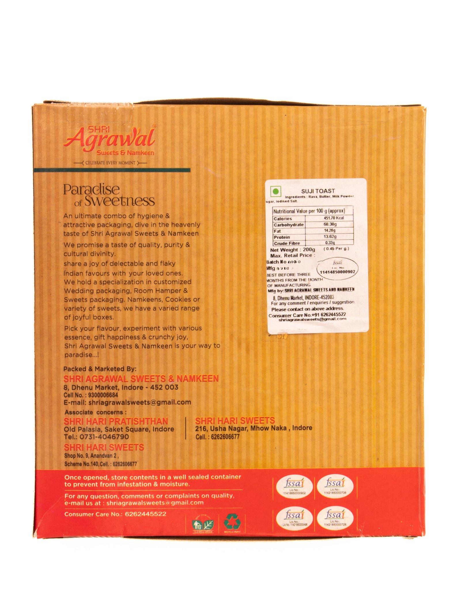 A perfect accompaniment with your tea time, Agrawal Sweets’ pure butter suji toast are made with finest ingredient and baked at just perfect temperature to give you an everlasting taste.